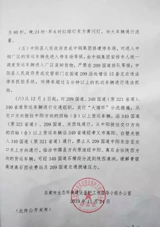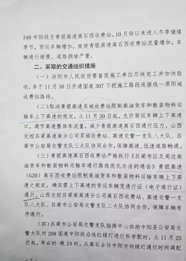 2、青银高速离石西收费站严格执行《吕梁市区及周边柴油货车和散装物料运输车通行路线优化办法的通告》青银高速(G20)离石西收费站限制柴油货车和散装物料运输车上下高速之规定,确实需上下高速的货运车辆凭通行证(电子通行证)通行。