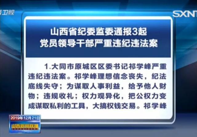 1.大同市原城区区委书记祁学峰严重违纪违法案。祁学峰理想信念丧失,纪法底线失守;为谋取人事利益,给予他人财物;违规收礼;权力观异化,把公权力变成谋取私利的工具,大搞权钱交易。祁学峰严重违反党的组织纪律、廉洁纪律和生活纪律,构成职务违法并涉嫌受贿犯罪,特别是在党的十八大甚至十九大后,仍不收敛、不收手,性质严重,情节恶劣,应予严肃处理。依据《中国******纪律处分条例》《中华人民共和国监察法》等有关规定,经山西省纪委常委会会议研究并报山西省委批准,决定给予祁学峰开除党籍处分;由山西省监委给予其开除公职处分;收缴其违纪所得;将其涉嫌犯罪问题移送检察机关依法审查起诉,所涉财物随案移送。