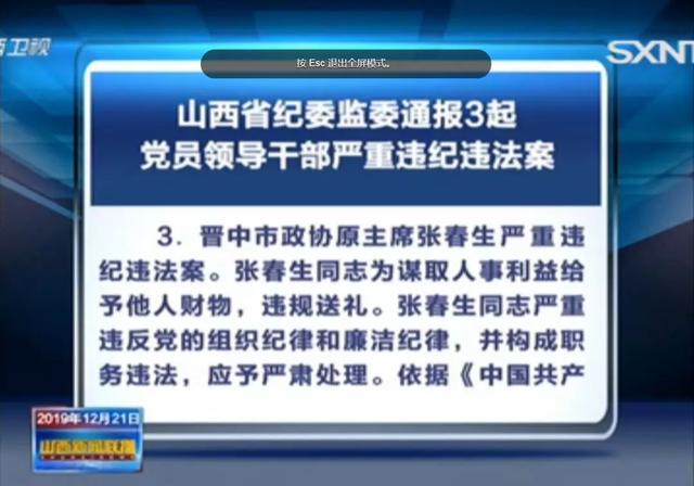 3. 晋中市政协原主席张春生严重违纪违法案。张春生同志为谋取人事利益给予他人财物;违规送礼。张春生同志严重违反党的组织纪律和廉洁纪律,并构成职务违法,应予严肃处理。依据《中国共产党纪律处分条例》《中华人民共和国监察法》等有关规定,经山西省纪委常委会会议研究并报山西省委批准,决定给予张春生同志撤销党内职务处分,鉴于其没有担任党内职务,给予其党内严重警告处分,按规定取消其享受的正厅级退休待遇,按二级巡视员确定其退休待遇。