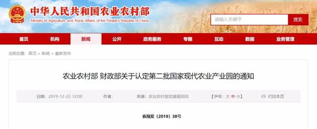 为贯彻落实中央一号文件关于建设现代农业产业园的决策部署,2017年以来,农业农村部、财政部批准创建了114个****现代农业产业园。各地坚持姓农、务农、为农、兴农的建园宗旨,强化创建指导,加大政策支持,建成了一批产业特色鲜明、要素高度集聚、设施装备先进、生产方式绿色、经济效益显著的现代农业产业园,有力示范带动了区域乡村产业发展,促进了农民增收。根据《农业农村部办公厅、财政部办公厅关于开展2019年****现代农业产业园创建绩效评价和认定工作的通知》(以下简称《通知》)要求,经绩效自评、认定申请、省级推荐、绩效评价和现场考察,农业农村部、财政部决定将创建成效突出、符合认定条件的29个现代农业产业园认定为第二批****现代农业产业园(具体名单见下方)。