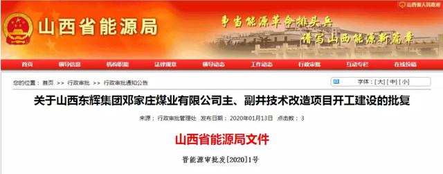 山西东辉集团邓家庄煤业有限公司隶属于山西东辉能源集团的限公司,是山西省煤矿企业兼并重组整合工作领导组办公室以晋煤重组办发〔2009〕82号文批准保留的煤矿。该矿矿区面积13.1782km2,为证照齐全的生产矿井,批准开采1号~5号煤层,核定生产能力为120万吨/年。为了优化各井筒功能,解决矿井大型设备辅助运输和上下人员问题, 2019年7月12日山西东辉能源集团的限公司以东辉集字〔2019〕66号文件批准项目建议书,10月26日省能源局以晋能源审批发〔2019〕38号文件批准初步设计;12月25日山西煤矿****监察局以晋煤监安二许〔2019〕153号文对矿井改建项目****设施设计进行了批复。施工准备方面,该项目已选定了施工、监理单位,质量监督已在吕梁市煤炭工程质量监督站注册登记,施工组织设计已通过设计、建设、施工、监理等单位会审,项目建设前期审批及准备工作已基本就绪。经审查,同意你局意见,山西东辉集团邓家庄煤业有限公司主、副井技术改造项目可于2020年1月8日开工建设,建设工期8.3个月。你局要加强对该项目建设期间的基础技术管理和工程进展情况的监督检查,并督促该矿做好以下工作: