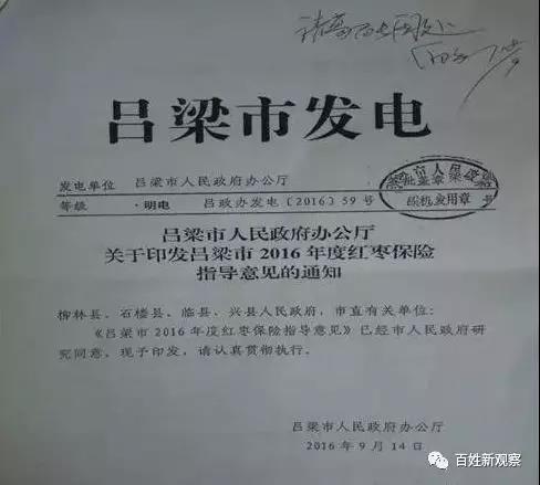 在山西吕梁市沿黄(河)4县,有成千上万枣农按市政府文件实投保42记者前往当地走访中,虽然山西保监局和中华保险山西分公司等均表示该保险为扶贫保险,赔付没有一点问题;但记者看到无论是市政府文件还是保险公司开出的所谓的保单,均表明枣农投保的是种植业险;记者梳理之所以发生断崖式降低赔付,是因保险公司按价格指数险赔付导致;记者仅以投保面积的临县为例,发现按种植业险要比价格指数险多赔付约5000多万元;如按承保保险公司目前统一赔付方式计算,该项扶贫保险涉嫌少赔付约上亿元。