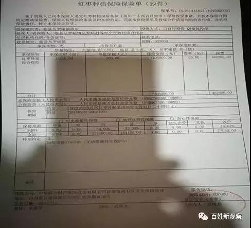 其中,科长还向记者出示了承保保险公司2016年度以乡镇为投保单位开具的“红枣种植业保险险单(抄件)”;记者随机查看了几份所谓的保单,承保险种、保额等和吕梁市59号明电理赔方按一致。