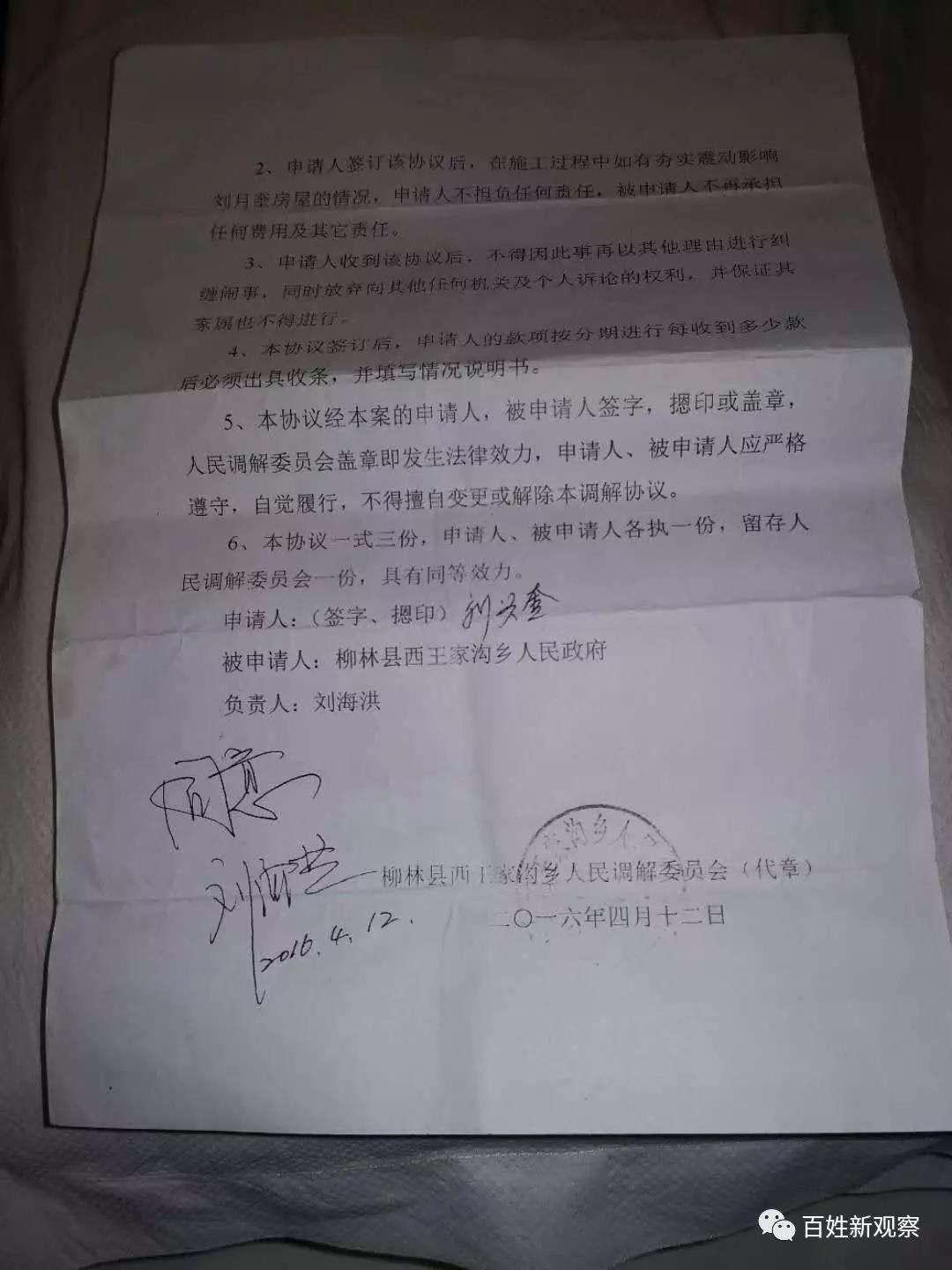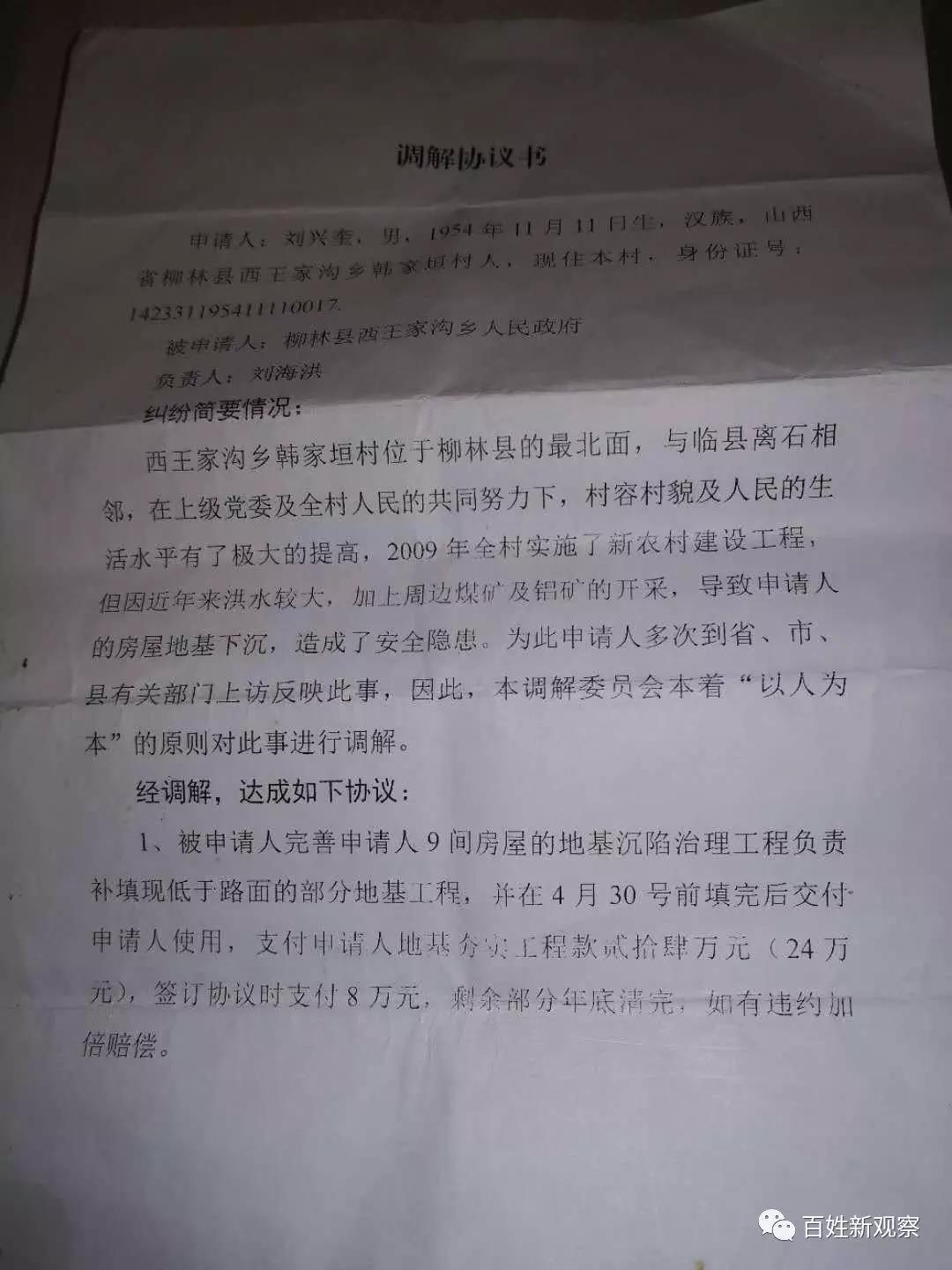 据刘兴奎讲,因为房子这件事,早在2010年清明节,他就找刘海洪谈过此事,当时刘海洪的回复是让他不要闹,会给他满意的交代。一句空头话,拖了刘兴奎七年。后来,地基受损下沉开裂情况越来越严重,紧靠刘兴奎家的刘月奎的平房地基下沉也变为了危房,到了不得不修的地步。在刘兴奎的强烈要求下,2016年1月,与西王家沟乡政府达成书面调节协议。