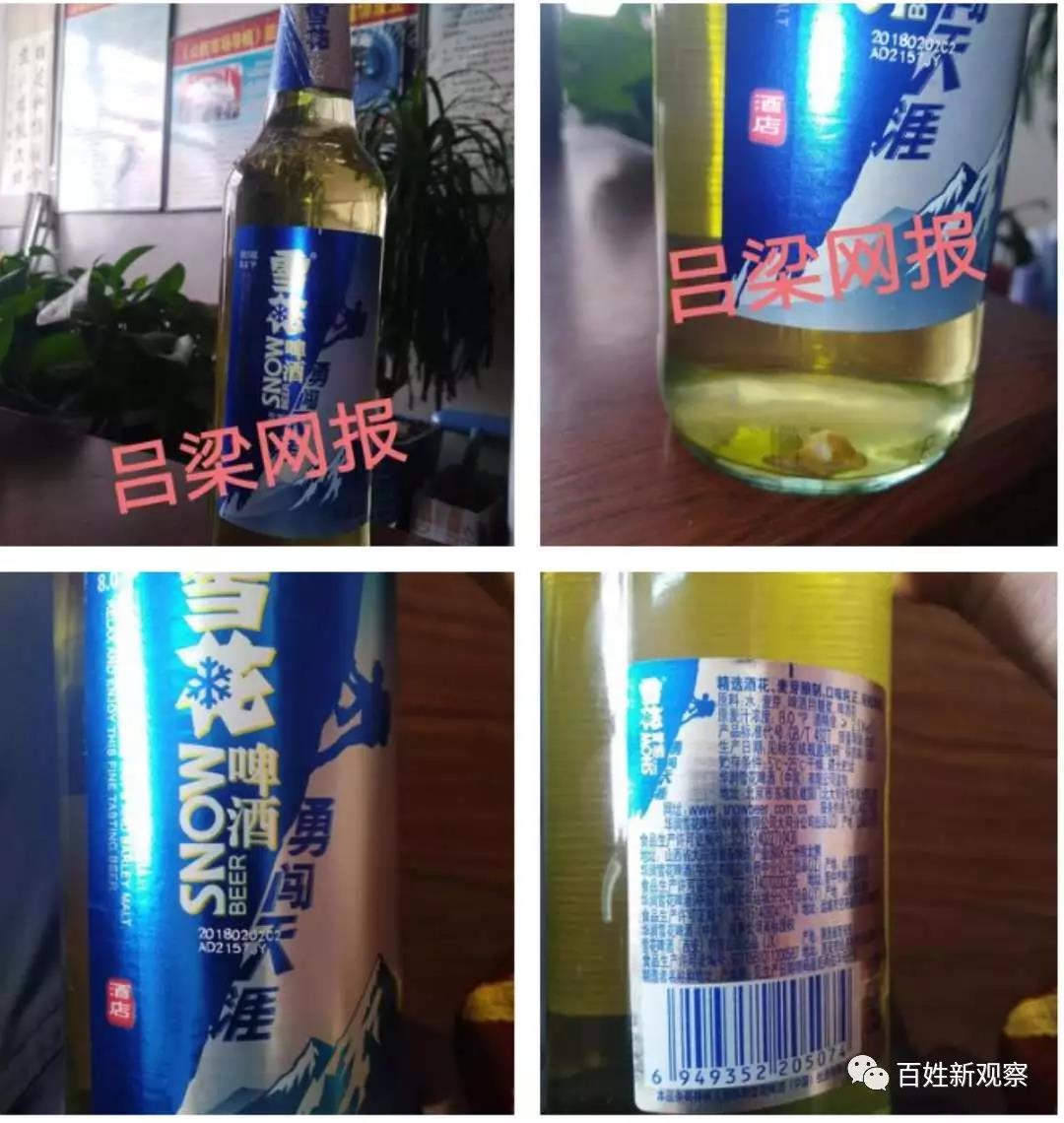 日前、吕梁市杨先生向本报反应,他在吕梁市交口县一饭店吃饭时买了几瓶啤酒,在正要打开其中一瓶的时候发现,在瓶内底部有大约2厘米厂0.2-0.6厘米宽的不明东西在里面,考虑到怕喝酒进去对身体产生危害,于是就把这瓶啤酒留下并带回来交到山西市场导报吕梁工作站让呼吁一下,让雪花啤酒厂家在生产、检验等环节上严格把关、认真负责,让消费者放心消费。