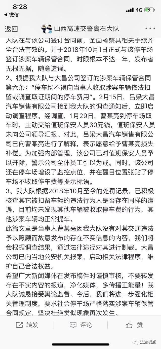 3、山西高速交警一支队八大队根据2018年10月至今的处罚记录,已积极核查其它被扣留车辆的违法行为人是否存在同样的遭遇,目前均未发现其他车辆被收取停车费的行为,其他涉案车辆均正常提车。