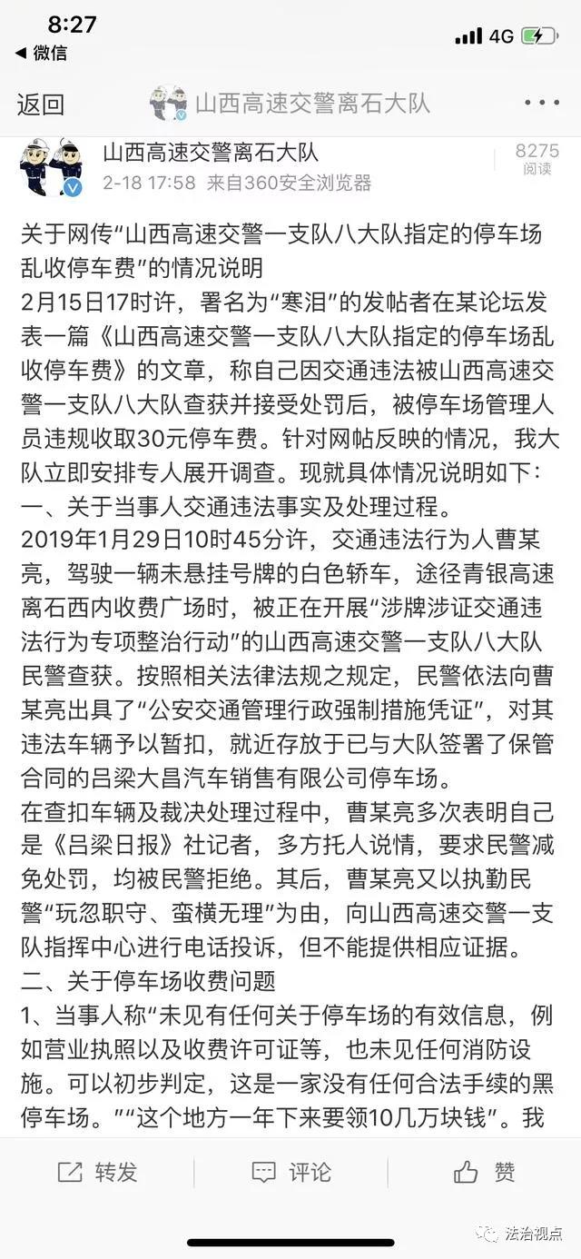 2月15日17时许,署名为“寒泪”的发帖者在某论坛发表一篇《山西高速交警一支队八大队指定的停车场乱收停车费》的文章,称自己因交通违法被山西高速交警一支队八大队查获并接受处罚后,被停车场管理人员违规收取30元停车费。针对网帖反映的情况,山西省公安厅交通警察总队高速公路一支队八大队安排专人展开调查,并在山西省公安厅交通警察总队高速公路一支队八大队官方微博发布情况说明。